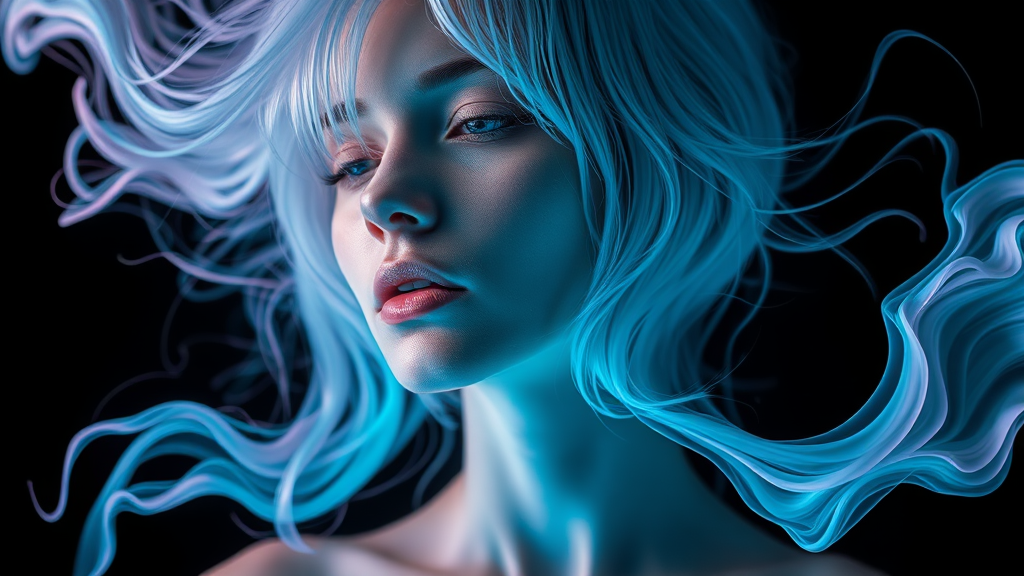A woman with opalescent hair on a black background, featuring trippy photography elements and fluid expressionism. The scene showcases distorted bodies and detailed facial features, blending dark white and light cyan tones with ghostcore aesthetics. Glowing pastels illuminate the composition, creating an ethereal atmosphere. The overall imagery conveys a sense of otherworldly beauty and surrealism.