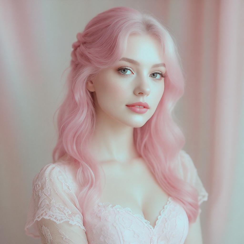 A woman with pastel pink hair styled in gentle waves wears a delicate pink lace dress, captured in the style of hyperrealism and photorealism. The image has an ultra-high definition clarity, with a dreamy soft-focus effect that enhances the realism. The scene is bathed in pastel colors, creating a serene and whimsical babycore atmosphere, with an elongated aspect ratio of 1:2. Her expression is serene, exuding a sense of softness and tranquility, as the soft pastel hues seamlessly blend into the background, adding to the ethereal ambiance.