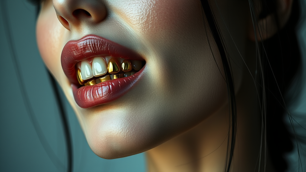 A woman with prominent jawline and shimmering gold teeth, envisioned in a futuristic minimalist style, featuring restrained forms and a darkly romantic aesthetic. Inspired by the Bechers' typologies, the imagery is glossy and intricate, focusing on close-up perspectives. The composition evokes a sense of raw, refined elegance, blending simplicity with complex detail.