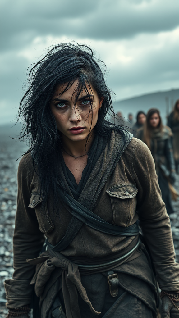 A woman with raven-black hair and piercing green eyes, streaked with dirt and wearing tattered rags, stumbles free from the dark confines of a dungeon into an endless grey wasteland. Her eyes, hollowed by hardship, tell tales of survival as she moves among other weary souls, each garbed in similar rags. The land around them bears the bleakness of forgotten battles, akin to the ancient struggles of Tolkien's world, where Hillmen and Dunlendings once roamed. As the group trudges through the desolate expanse, the oppressive sky hangs heavy above, concealing any glimpse of hope or redemption. Yet, driven by an unyielding resilience, they press onward, their spirits flickering like the last embers of a dying fire.