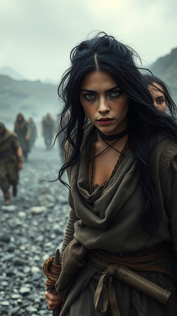 A woman with raven-black hair and piercing green eyes, her face smeared with grime and her body clad in tattered remnants of cloth, navigates a desolate, ash-covered wasteland. Escaping the oppressive confines of a dungeon, she now traverses this bleak expanse alongside others who share similarly sunken eyes and ragged attire. Their figures are reminiscent of Tolkien's vivid landscapes and the rugged clans like the Hillmen or Dunlendings, each step echoing with the silent resolve of those who seek freedom amidst a world draped in grey desolation.