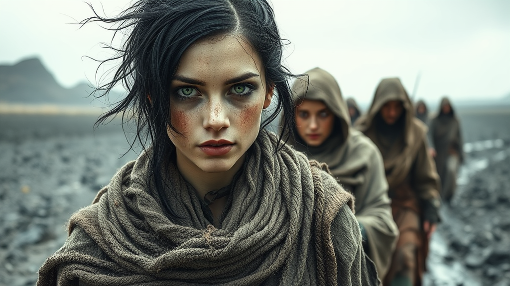 A woman with raven-black hair and vivid green eyes, her face smeared with earth, clad in tattered rags, has broken free from the chains of a haunting dungeon. She now traverses a desolate, grey wasteland alongside others draped in similar threadbare attire. Their eyes, hollow and sunken, tell tales of suffering, reminiscent of the Hillmen of Dunland from Tolkien's epics. The wasteland stretches endlessly, a bleak testament to their shared struggle for survival.