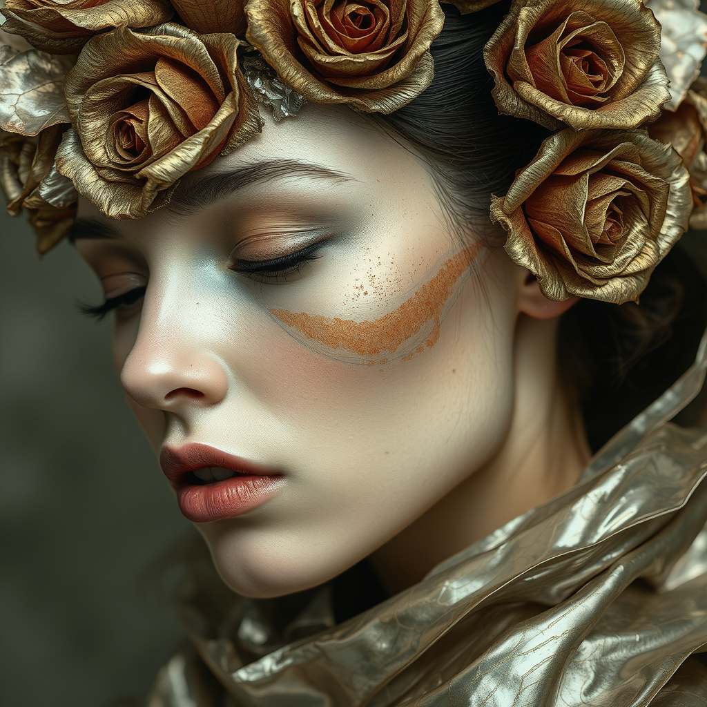 A woman with roses seamlessly integrated into her visage, her features crafted from liquid metal and layered fabrications, evoking the intricate style of Nicola Samori. Drawing inspiration from Brian Jungen's exquisite detail and Leo Putz's artful compositions, her form is a mesmerizing blend of light silver and deep brown. The entire scene captures a raw, ethereal beauty, with metallic petals and flowing textures creating an otherworldly aura.