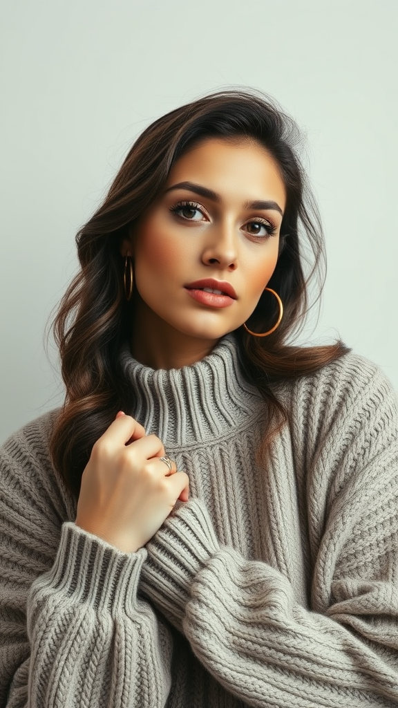 A woman with striking brown hoop earrings and a cozy sweater, her pose echoing the graceful curves found in Shirin Neshat's art, surrounded by a palette of light silver and gray. Captured in candid celebrity moments, with a face that speaks with the powerful expressiveness of Penelope Rosemont's work, her gaze holds a strong and captivating story. The scene hints at folk and naïve art influences, blending intimacy with charisma, set in an elongated vertical composition.
