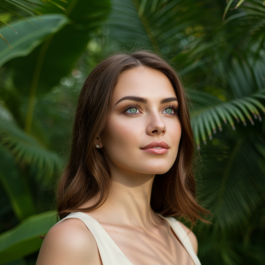 A woman with striking emerald green eyes and chestnut brown hair stands against a backdrop of lush tropical foliage. She is dressed in a sleeveless, ivory top that complements the vibrant greenery behind her. Her gaze is directed upwards, and she wears a gentle, contemplative smile. The soft lighting casts delicate shadows across her skin, hinting at a mellow, cloud-covered sky. The scene evokes a sense of calm and peacefulness, emphasizing the harmony of natural beauty and tranquility.