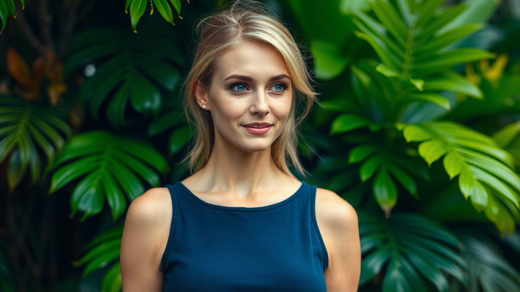A woman with striking light blue eyes and sun-kissed blonde hair stands against a lush backdrop of vibrant tropical foliage. She is dressed in a sleeveless, deep navy top that contrasts beautifully with the bright verdant leaves surrounding her. Her gaze is directed thoughtfully to the side, accompanied by a soft, serene smile. The gentle lighting casts delicate shadows across her skin, suggesting an overcast day with diffused, natural light. The mood of the scene is peaceful and relaxed, highlighting her natural beauty and the tranquility of the surroundings.