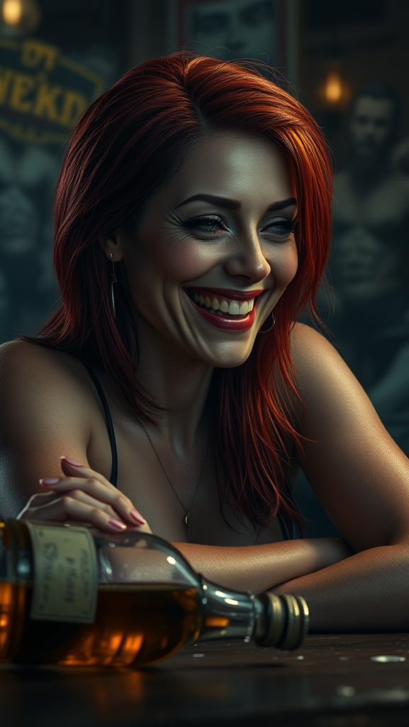 A woman with striking red hair sits at a dimly lit bar, laughing and winking with a drunken charm. Her surroundings are gritty, reflecting the raw realism of the scene. A tipped-over bottle of whiskey rests beside her, hinting at the night's indulgence. The digital painting captures a cinematic essence using Unreal Engine 5 and Octane Render, showcasing hyperrealistic detail. Her eyes, vividly detailed, radiate mischievousness in high dynamic range. The image focuses closely on her face, emphasizing the intricate textures of her skin. Behind her, an artistic blur hints at a surreal background of disjointed forms and abstract, poorly drawn figures, suggesting a chaotic atmosphere. The scene evokes a sense of both allure and disarray, blending realism with a touch of surreal mutation.