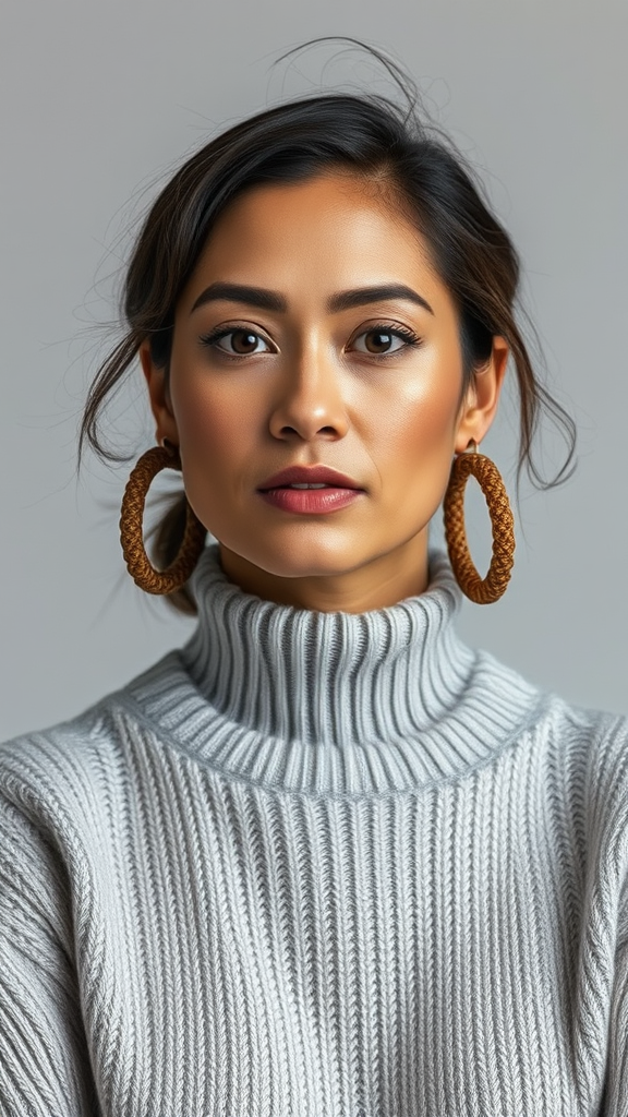 A woman with strong facial expression wearing a light silver sweater and textured brown hoop earrings, inspired by Shirin Neshat's style. The image captures graceful curves in a candid, folk/naïve manner reminiscent of Penelope Rosemont's works. The palette features subtle shades of light gray, evoking an intimate and candid celebrity moment.