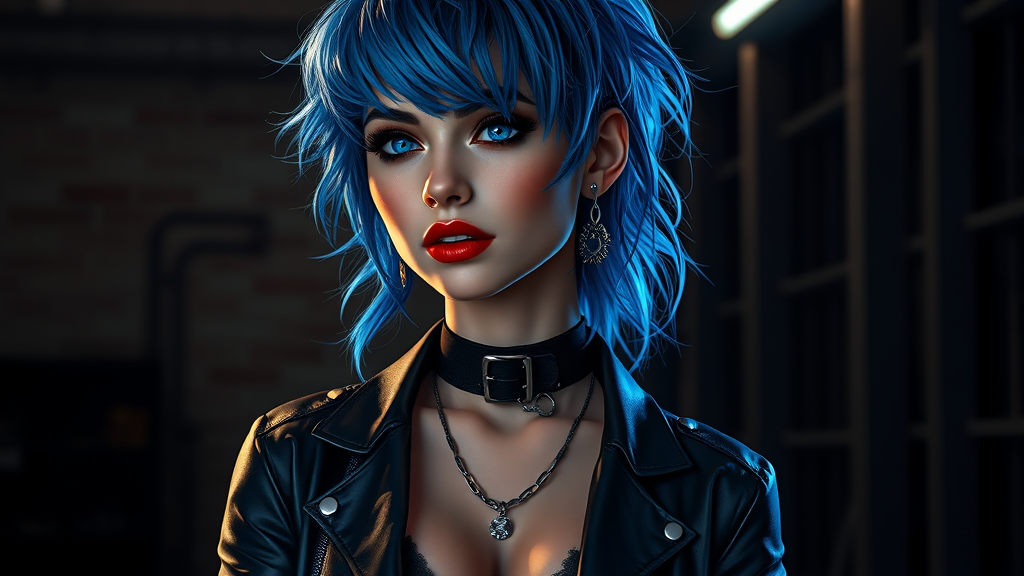 A woman with vibrant, tousled blue hair and multiple piercings stands against a dimly lit industrial backdrop. Her intense blue eyes and dark makeup contrast with the shadowy setting, highlighting her striking facial features. She wears a black choker and a sleek leather shirt, adorned with an array of earrings and a small nose piercing. A tattoo snakes down her arm, complementing her rock-inspired attire. Her elegant pose is accentuated by her attire's edgy style, revealing a glimpse of her navel. The scene is captured in a vivid, cinematic light, with intricate detail in her glowing skin and realistic eye texture. Despite the dark background, a beautiful, detailed glow envelops her figure, giving her an enigmatic allure. The image features a sharp focus, smooth aesthetics, and an exquisite level of detail, reminiscent of a character portrait in a high-resolution octane render, with a subtle touch of cartoon style.