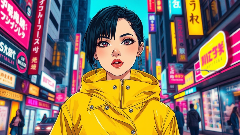 A woman with vivid, symmetrical features stands on a bustling city street, her sleek raincoat shimmering under neon lights. Rendered in intricate anime style, she embodies the essence of cyberpunk culture with her bold fashion and futuristic aesthetic. The vibrant cityscape bursts with the vibrant colors and dynamic energy of a full-color manga visual style. Influenced by Cyberpunk 2077's atmosphere, the scene captures an electrifying fusion of technology and traditional anime artistry, offering a key visual that feels both familiar and cutting-edge, with the stylistic nuances reminiscent of InkPunk768 and nartfixer techniques.