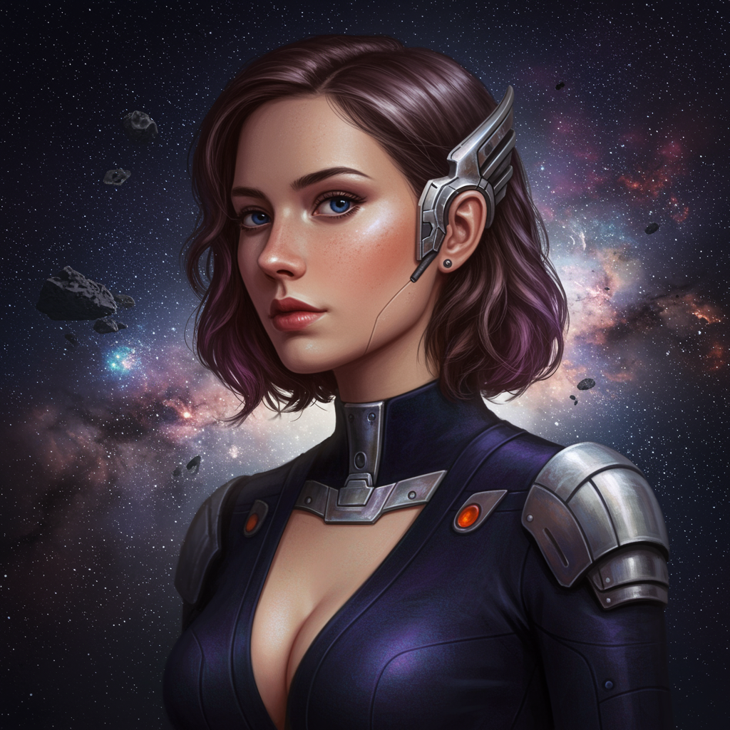 A woman's character portrait in space art style, featuring high-detailed official artwork with fantastic hyperrealism, dynamic lighting, and realistic textures. The image might include minor imperfections like jpeg artifacts or slightly irregular anatomy, giving it an artistic, expressive quality. The setting is cosmic with the intricate interplay of space elements, highlighting the subject's unique features amidst a celestial background.