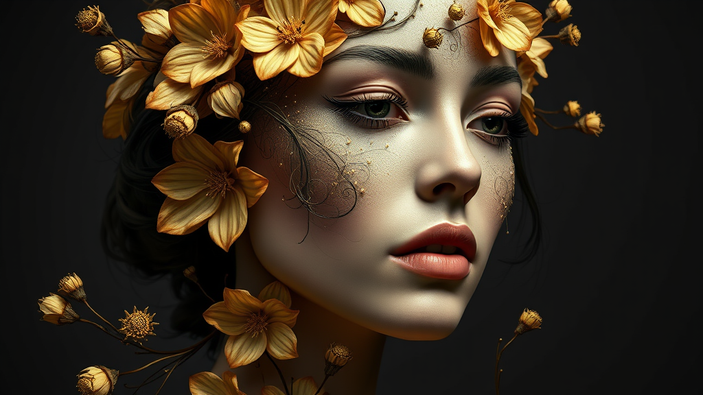A woman's face adorned with golden hues, inspired by nature's intricate designs, set against a dark gray background in a loose, flowing composition; an elegant fusion of flowerpunk elements with the texture and depth of Zbrush artistry, capturing the essence of chiaroscuro portraitures in a realistic style with a hint of surreal grace.