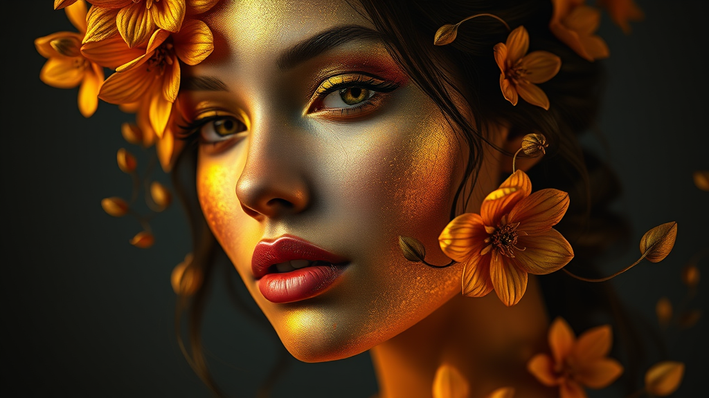 A woman’s face adorned with lustrous golden hues, infused with nature-inspired elements, set against a backdrop of dark gray tones in a fluid composition. Embodying a flowerpunk style with elements of ZBrush, the image captures an elegant realism. Rich chiaroscuro portraiture illuminates her features, revealing the intricate play of light and shadow. Aspect ratio 2:3, visualizing a harmonious blend of organic beauty and creative flair.