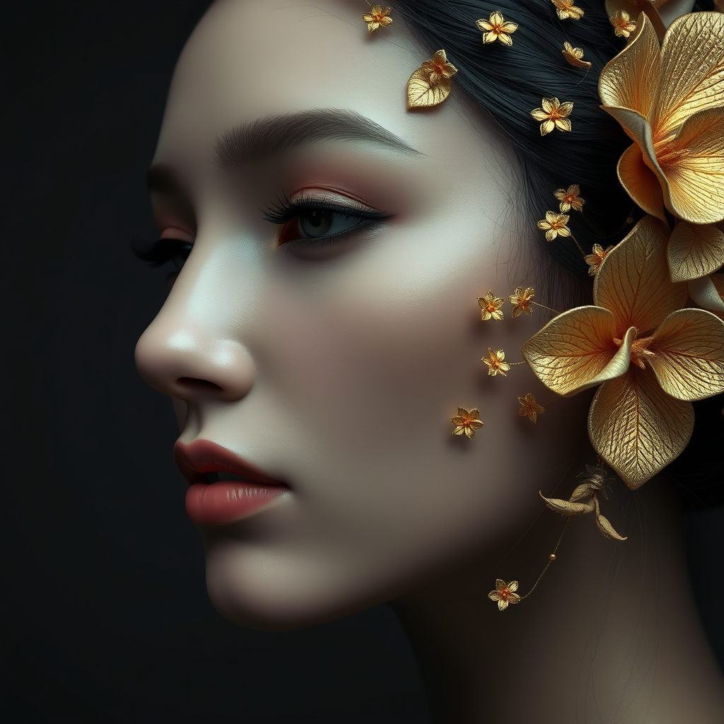 A woman's face adorned with shimmering gold accents, evoking the serenity of nature-inspired compositions, set against a moody dark gray backdrop. The scene unfolds in a loosely structured, flowerpunk atmosphere. Crafted with the finesse of zbrush, it embodies elegant realism, with elements of chiaroscuro lending depth. Her expression captures a timeless grace, as if emerging from a dream where art and nature intertwine seamlessly.