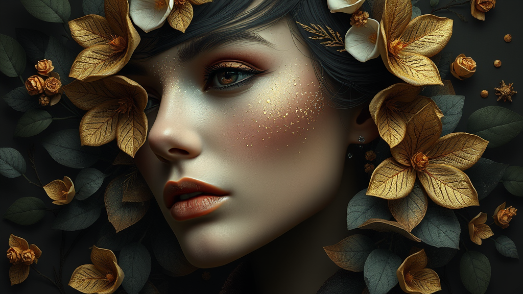A woman's face adorned with shimmering golden accents, set against a backdrop of nature-inspired motifs, with hues of dark gray creating a loose and fluid composition. Infused with elements of flowerpunk, the portrait embodies elegant realism and the intricacies of chiaroscuro, capturing an ethereal and timeless essence, crafted with the precision of a ZBrush masterpiece.