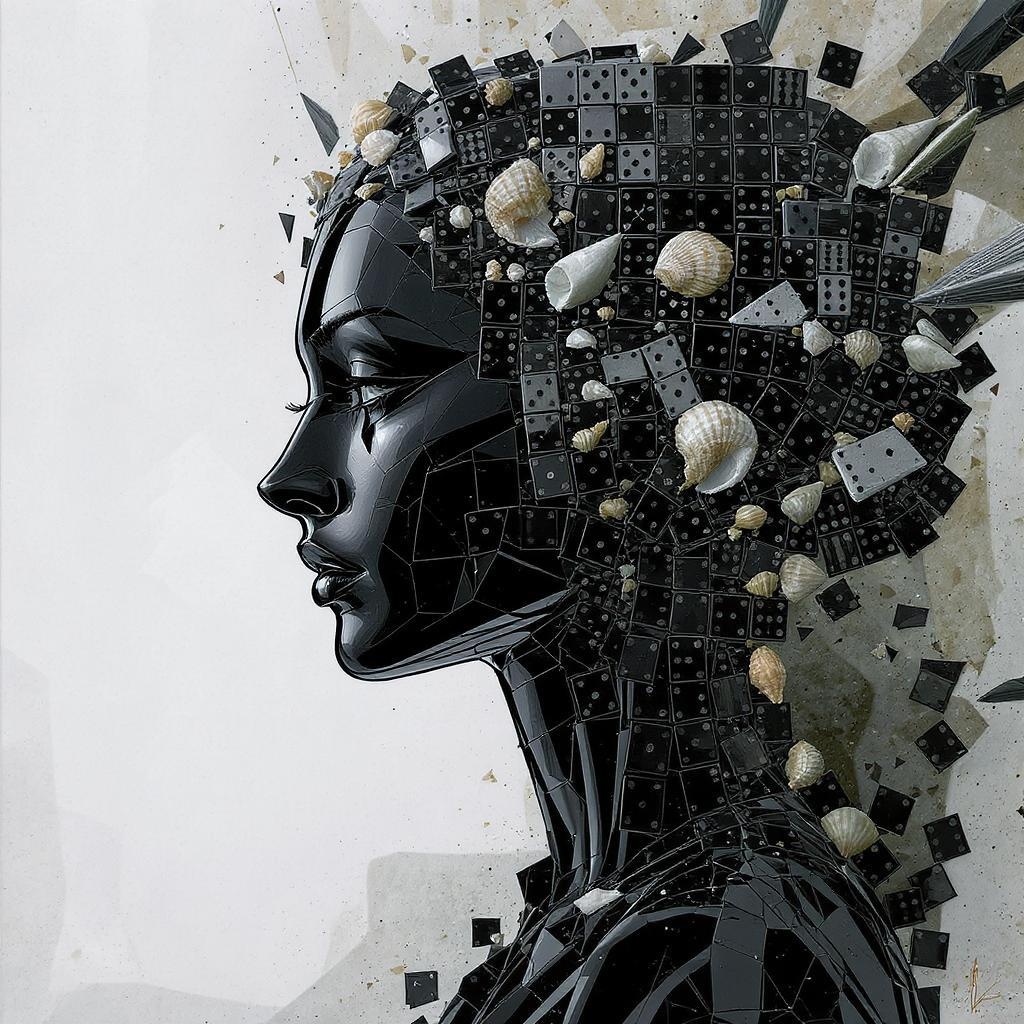 A woman's head composed of glossy ebony domino tiles interspersed with shattered sea shells, reminiscent of Octopath Traveler's aesthetic. The image blends elements of vanitas and altermodern art styles with a surreal, angular design. The scene captures a fusion of contrasting textures and shapes, evoking a sense of layered complexity and timeless beauty.