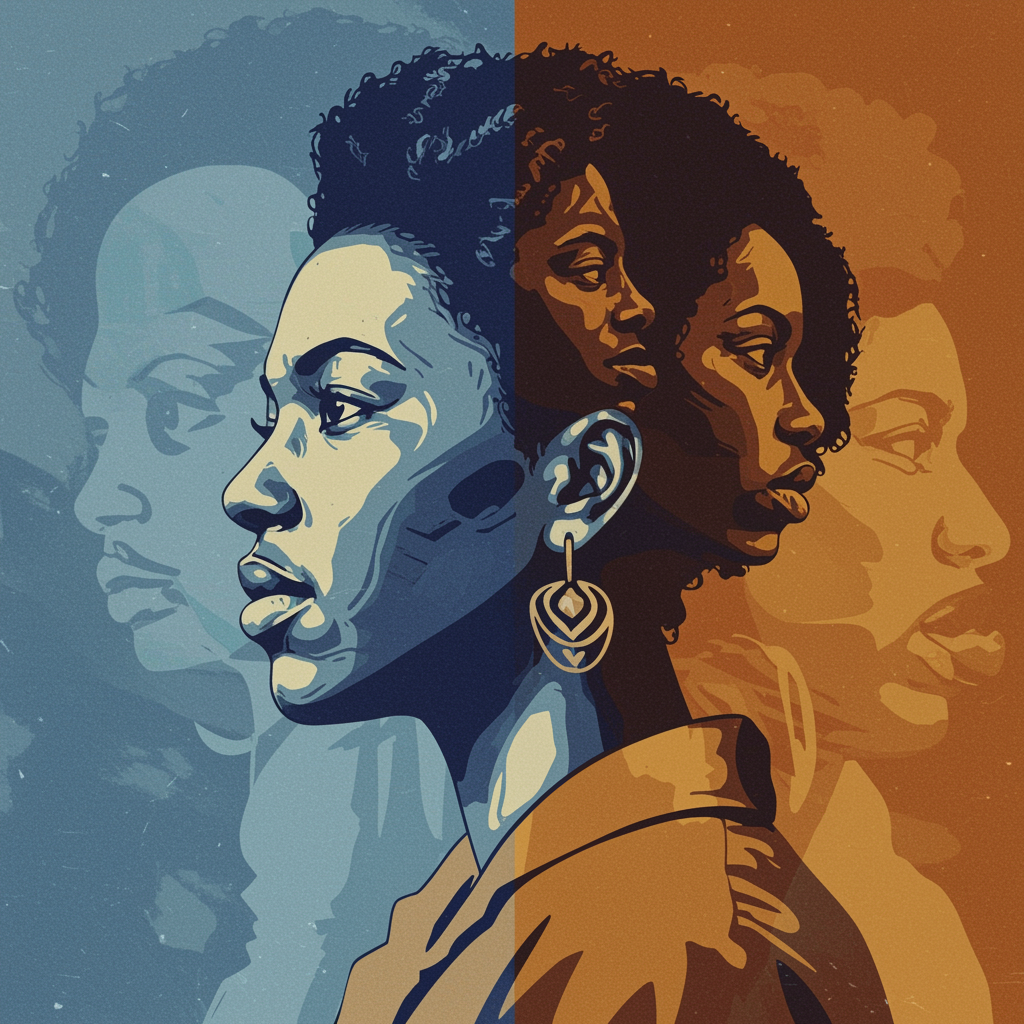 A woman's profile rendered in the style of iconic civil rights images, blending light indigo and deep amber hues, featuring colorfully abstracted faces reminiscent of iconic album covers. The composition echoes chiaroscuro woodcuts, with split toning elements, inspired by the artistic approach of Aaron Douglas. The artwork strikes a balance between traditional and modern, encapsulating an essence of timeless cultural significance.