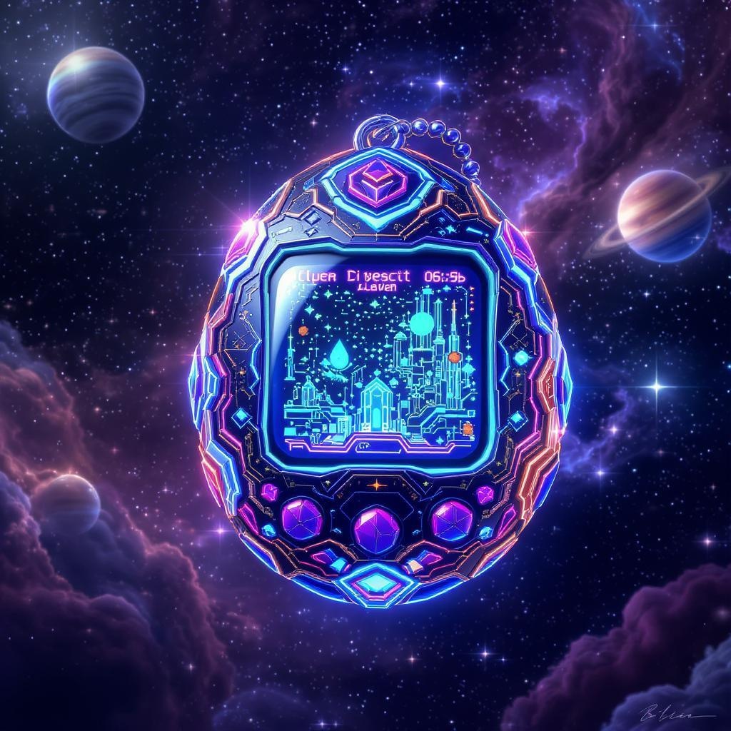 A wondrous cyber Tamagotchi thrives within the neon labyrinth of the universe, nestled amidst the swirling gases of distant nebulae and the shimmering rings of forgotten planets. Its digital shell, encrusted with glinting nano-crystals, pulses with an otherworldly glow, mimicking the resplendent dance of alien auroras. As an artifact from an ancient, advanced civilization, it embodies a fusion of cutting-edge technology and intricate artistry. By connecting to the woven matrices of the cosmos, it seeks to bond with its caretaker, deciphering the cryptic codes of the stars to communicate. Together, they explore sprawling techno-cities afloat in the vacuum, bustling bazaars of interstellar trade inhabited by myriad species, and lush exoplanets where metallic fauna coexist harmoniously amidst iridescent flora. With each interaction, the alien Tamagotchi evolves, adopting traits from the beings it encounters, creating an ever-evolving symphony of life as it journeys through the vast tapestry of the galaxy.