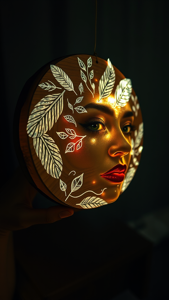 A wooden disc crafted from luminous crystals, casting an ethereal glow on a visage, in the vein of surreal fashion photography. Featuring intricate feather motifs and organic nature-inspired shapes, creating a striking juxtaposition of light and shadow. The ephemeral installation is embellished with detailed depictions of nature, capturing a surreal interplay of elements --ar 4:5 --s 550.