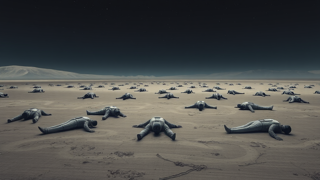 A world devoid of life, where deserted suits lay scattered, empty vessels stretched across the flat landscape.