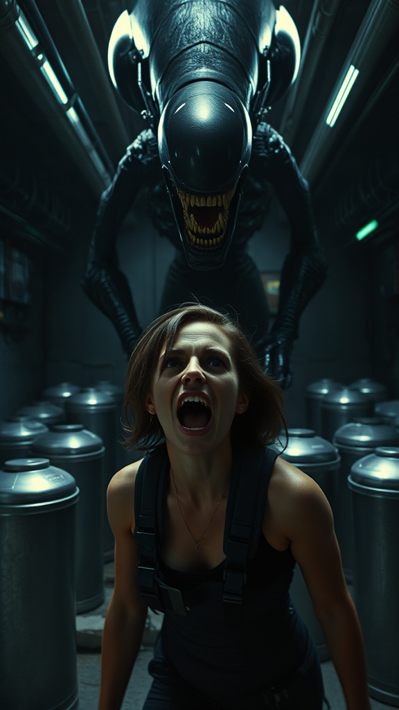 A worn VHS copy of the movie "ALIEN" captures the tension in Ridley Scott's iconic style: an otherworldly creature looms menacingly above, its shadowy form contrasting with the harsh industrial backdrop. In front, Ellen Ripley, portrayed by Sigourney Weaver, is caught mid-scream, her face twisted in raw fear as she strategizes a desperate escape. Scattered behind them are industrial oxygen tanks, their metallic surfaces glinting under dim, flickering lights. The room's oppressive darkness is punctuated by hints of eerie green and blue glows, creating a claustrophobic, haunting atmosphere. Photographed in a wide shot reminiscent of a Sony ALPHA 7R V masterpiece, the scene exudes a gritty, filmic quality with cinematic lighting that heightens the suspense.