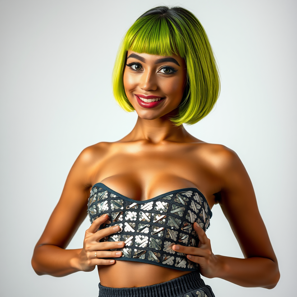 A young 24-year-old Maranao-Guarani female circus performer, exuding subtle defiance, stands playfully in the frame, capturing the essence of both her cultural heritage and her unique style. Her tight, sculpted body showcases a flat stomach with defined muscle grooves, complemented by small breasts and a flat chest. Her golden brown skin, with a hint of warmth, reflects a soft light, enhancing the visibility of her skin pores and texture. Her striking cat eyes, deep-set and grey, are highlighted by long, elegant lashes. Her bright lime green bob haircut with baby bangs frames her face, while her softly gradient brown eyebrows accentuate her delicate features. She wears a dazzling sequin-embellished crop top that glistens with small reflective sequins, perfect for any nighttime event, paired with low-rise velour tracksuit pants that feature a plush texture for a retro street style. Standing by the rule of thirds, she poses with her hands resting on her waist, slightly leaning to one side with a welcoming smile. In the background, a pair of rain boots sits in a puddle with floating leaves, creating a serene scene. Soft natural lighting, reminiscent of Oskar Fischinger's unknown style, illuminates the model with a gentle fill flash, adding an ethereal quality to the composition.