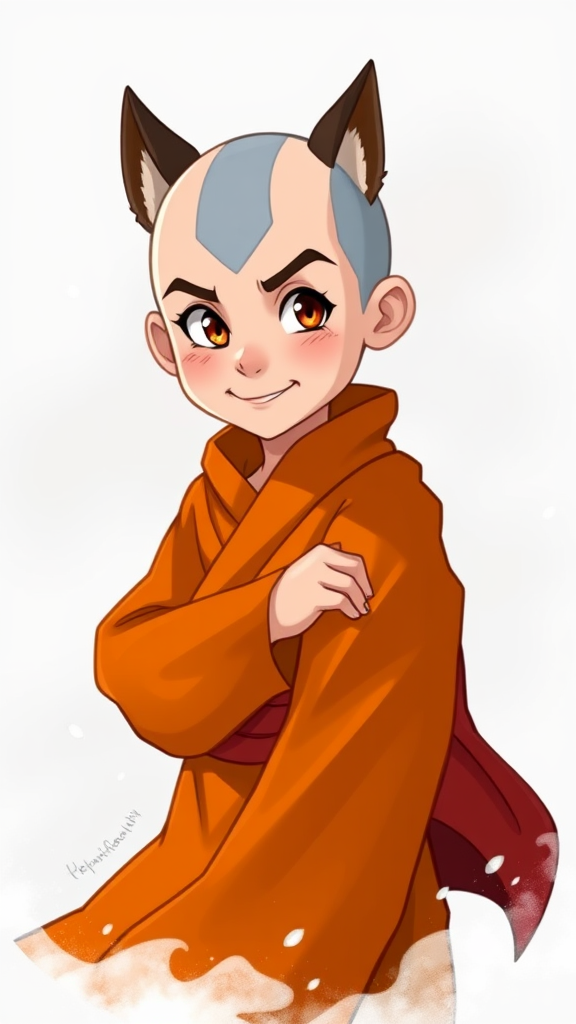 A young Aang, the last airbender, depicted in a furaffinity style, wearing flowing orange robes with hints of deep red; his playful demeanor highlighted by a mischievous smile, eyes full of adventure and a gentle breeze subtly lifting the fabric around him. Around him, elements of air swirl gently, accentuating his connection to the air element, while small, stylized animal ears peek through his shaved head, adding a whimsical touch.