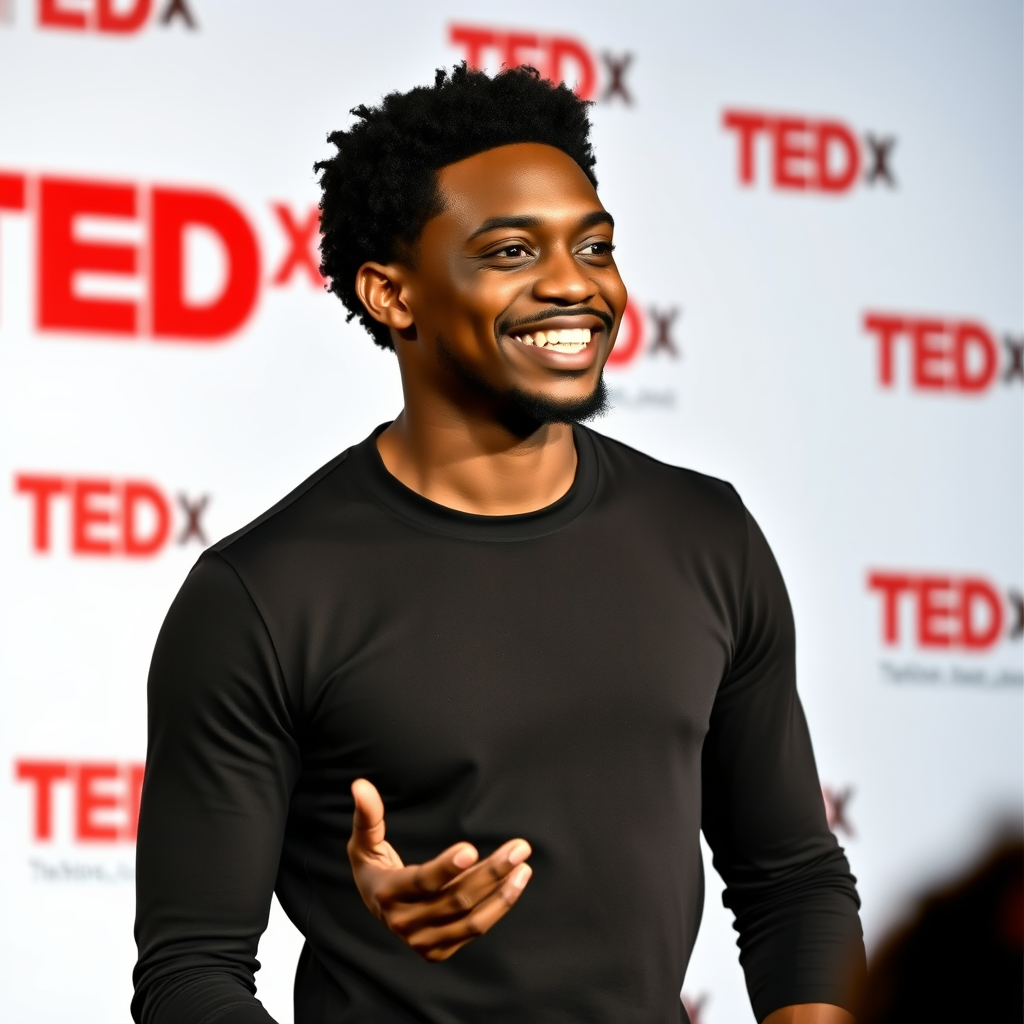 A young African man with a radiant smile confidently addressing the audience on stage at a TEDx event, set against a bright white backdrop adorned with TEDx logos, exuding an air of inspiration and motivation.
