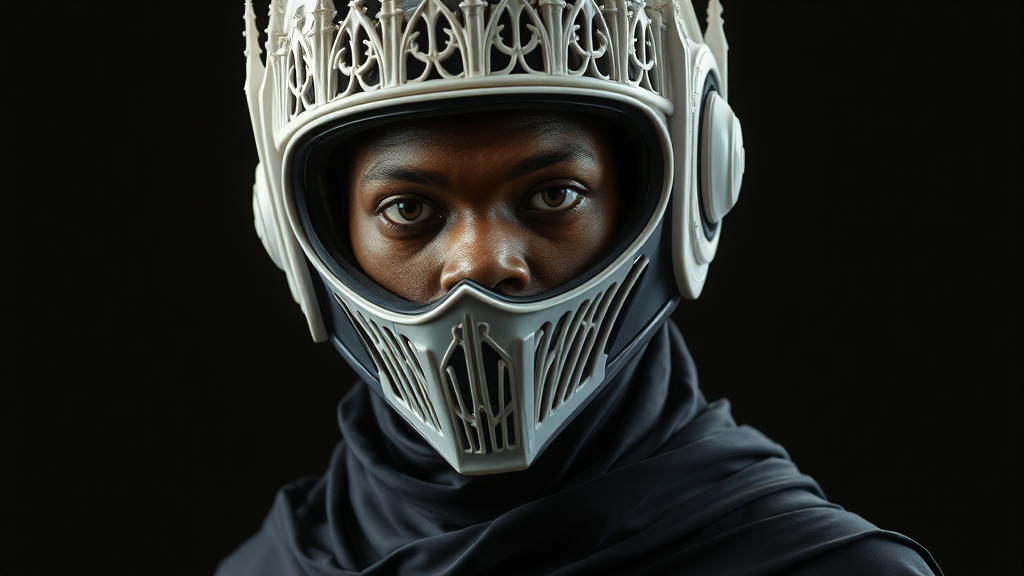 A young Afro-American man dons a full-face latex helmet intricately crafted to resemble an ornate white Gothic cathedral, adorned with delicate spires and elegant arches, leaving only his eyes exposed. He is clad in a sleek black neo-futuristic tunic that cascades in fluid waves around him. The scene is infused with an 80s dark fantasy vibe, illuminated by high-fashion magazine lighting that casts sharp highlights and stark shadows. The background is a simple dark canvas with a subtle gradient, enhancing the retro film photography feel. The image captures a hyperrealistic essence through the grainy and noisy textures of a 35mm camera lens, focusing on a medium close-up that naturally enhances depth, with slightly elongated arches and a softly draped fabric adding a unique twist to the ensemble.
