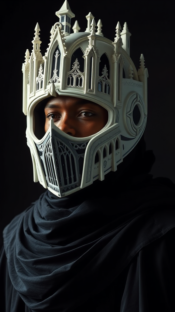 A young Afro-American man wears a full-face cover latex helmet intricately designed to resemble a majestic white Gothic cathedral, complete with spires, arches, and delicate tracery, leaving only his eyes visible. He is adorned in a black neo-futuristic tunic featuring layers of flowing fabric that suggest movement and mystery. The overall aesthetic is reminiscent of 80s dark fantasy, with high-fashion magazine lighting accentuating sharp highlights and casting deep shadows. The simple dark background transitions subtly with a gradient effect, enhancing the moody atmosphere. Shot in a retro film photography style, the image features a grainy, noisy texture characteristic of 35mm film. The scene is captured in a hyperrealistic medium close-up, employing a natural depth of field that draws attention to the intricate details of the ensemble.