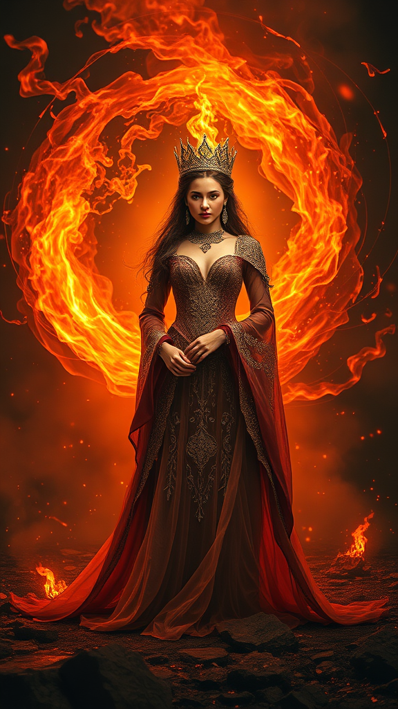 A young and beautiful Queen of Fire stands gracefully on the ground within a swirling fog of flames, exuding an aura of glory. She is depicted in intricate, regal clothing, her face a vision of perfection and beauty. She strikes an elegant pose, with the entire scene rendered in a perfect composition. The setting features elements reminiscent of a circuit board, blending fantasy with the allure of technology. The style is a trial dark fantasy, with photorealistic concept art showcasing intense shadows and dramatic lighting. The image is captured in ultra-detailed 8k resolution, akin to a realistic 3D octane render, with sharp focus and an atmosphere ideal for a high-quality wallpaper. The visual presentation is enhanced by HDR techniques, maintaining high-definition clarity and a stylized flair.