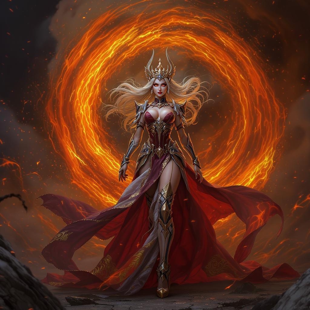A young and stunningly beautiful Queen of Fire stands majestically on the ground enveloped by a spiral of fiery fog in the background. She exudes glory with her full-body pose, her attire an intricate blend of regal and modern elements. Her face is perfect and strikingly beautiful, her stance elegant and commanding. The composition is flawlessly balanced, capturing the realism of a circuit-board-inspired fantasy realm. This illustration, suitable for ArtStation's dark fantasy trials, is photorealistic with intense shadows and dramatic lighting. Presented in 8k resolution, this ultra-detailed 3D octane render boasts sharp focus and HDR quality, creating a high-definition, stylized concept art that perfectly suits a wallpaper setting.