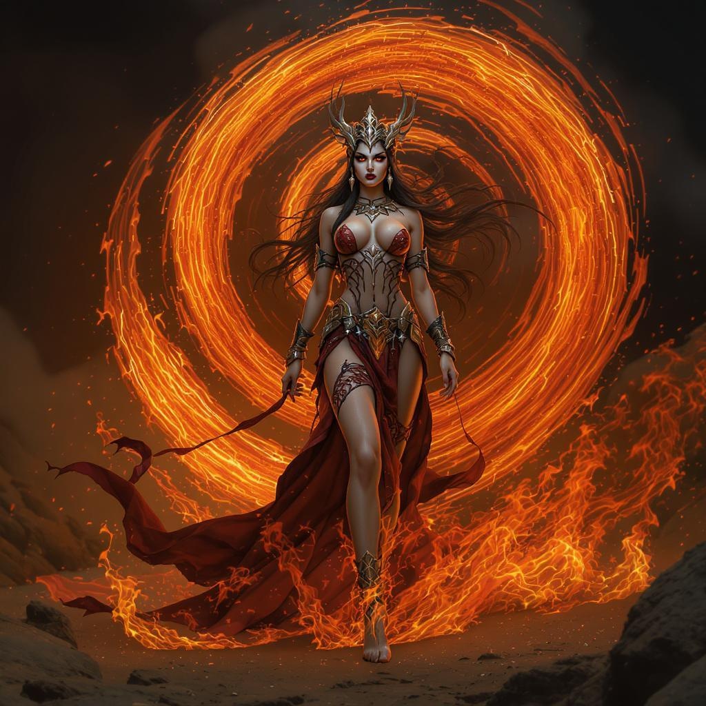 A young and stunningly beautiful woman, a Queen of Fire, stands regally on the ground amidst twisting tongues of flame, surrounded by a mesmerizing spiral backdrop. Her full-body presence radiates an aura of majesty, adorned in intricate clothing that speaks of ancient tribes and forgotten lands. Her face is flawlessly beautiful, a perfect blend of realism and fantasy, framed by an aura of intense light and shadow. Her elegant pose exudes authority and grace, captured in a perfect composition. She embodies the essence of both the mystical and the futuristic, with delicate patterns reminiscent of circuit boards subtly woven into her attire, symbolizing a bridge between worlds. This highly detailed, 3D-rendered concept art showcases an ultra-realistic portrayal in an 8k resolution, bringing forth the vibrancy of HDR imaging. The sharp focus on her form and the surrounding fiery element creates an intense visual impact, perfect for an immersive wallpaper experience, embodying the essence of tribal dark fantasy with unparalleled quality and definition.
