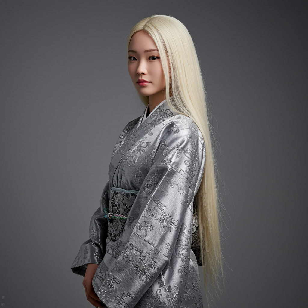 A young Asian woman dressed in a silver-hued kimono with intricate patterns, her blonde hair cascading gracefully down her back, standing gracefully with a serene expression, portrayed in a lifelike manner against a simple, unobtrusive backdrop.