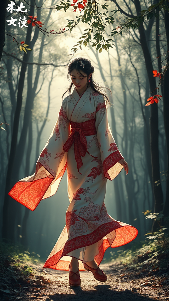 A young Asian woman gracefully wanders through a serene forest, her flowing kimono adorned with intricate patterns reminiscent of the Western Zhou Dynasty. The scene captures a delicate balance of dark whites and light reds, creating a romantic and mystical atmosphere. Rendered in the ultra-realistic style of a master illustrator, every detail from the gentle sway of her garment to the dappled sunlight filtering through the leaves is captured with sharp focus. The play of light and shadow casts a solarized glow, adding an ethereal quality that blurs the line between fantasy and reality.