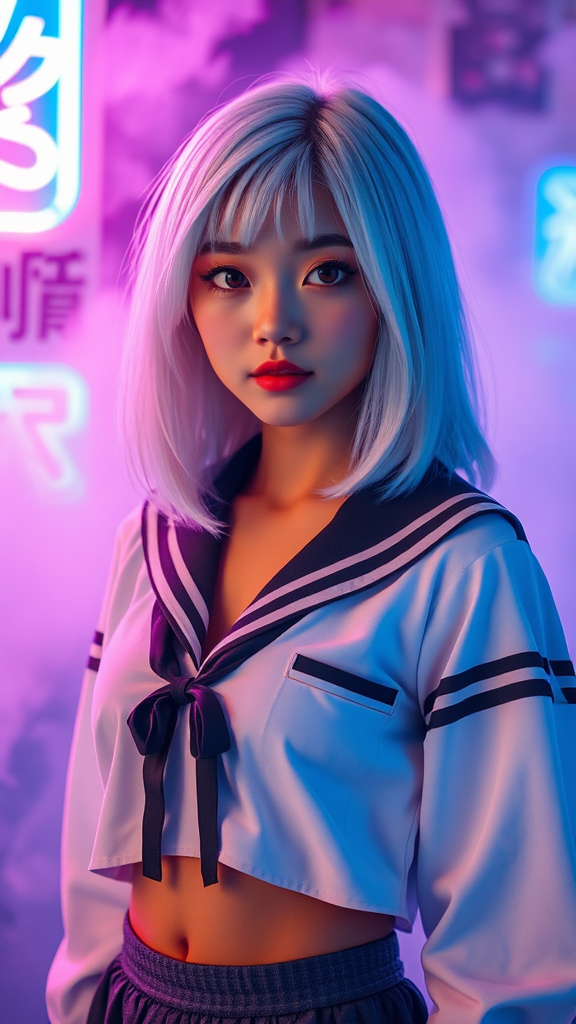 A young, beautiful Asian girl with striking white hair and captivating eyes stands confidently, her olive skin glowing under cinematic neon lights. Her medium-length white hair cascades gracefully, framing her perfectly symmetrical face. She has a petite, toned body with a schoolgirl uniform accentuating her silhouette, revealing a hint of midriff. Her small breasts add to her youthful charm. Surrounding her is an ethereal haze of vibrant smoke, enhanced by volumetric fog that creates a hyperrealistic, breathtaking scene in ultra-high definition. The lighting captures every intricate detail of her exquisite features, making her appear almost otherworldly.