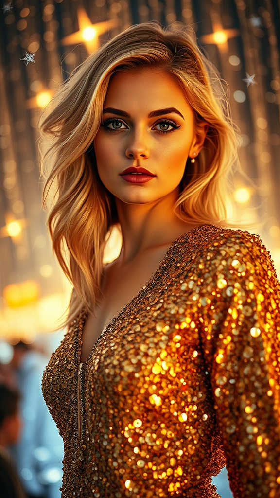 A young blonde woman adorned in shimmering gold sequins stands elegantly amidst a backdrop of sparkling lights and celestial stars, embodying vibrant postmodernism. Her attire is richly detailed, capturing the eye with intricate patterns and textures. The interplay of fleeting light casts delicate silver and warm orange hues upon her, evoking a dynamic yet ethereal atmosphere. Inspired by the rich photographic style of Max Bedulenko, the scene is captured in sharp focus, celebrating a festive, exuberant mood. Photographed with a Fujifilm X-T4 camera paired with a Sony FE 85mm f/1.4 GM lens, the image resonates with a raw, authentic style, balancing depth and radiance.
