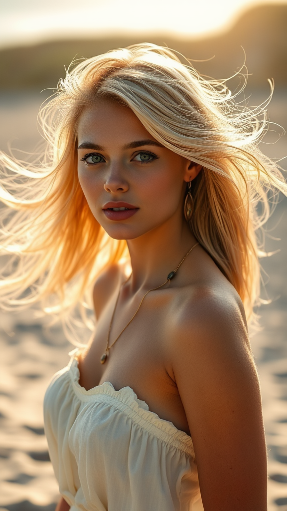 A young blonde woman with flowing hair stands gracefully on a sunlit beach, her presence a harmonious blend of dark gold and shimmering light bronze. She is adorned with modern, artisanal jewelry that reflects the radiant clusters of light surrounding her. The scene exudes an air of the French countryside, with her youthful energy palpable in every glance and gesture. Her accessories, unique and one-of-a-kind, complement the flattering lighting that enhances her natural beauty, creating a mesmerizing tableau of elegance and individuality.