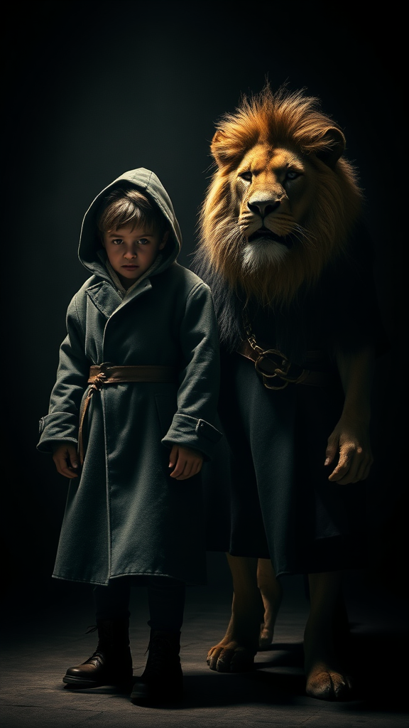 A young boy clad in a billowing coat and hood stands side by side with a majestic, full-length lion, both figures bathed in dramatic, cinematic lighting against a shadowy backdrop; the scene is richly detailed with a masterful play of light and shadow, enhanced by shallow depth of field, capturing the subtle textures of their garments and fur, creating an atmosphere of mystical camaraderie and silent strength.