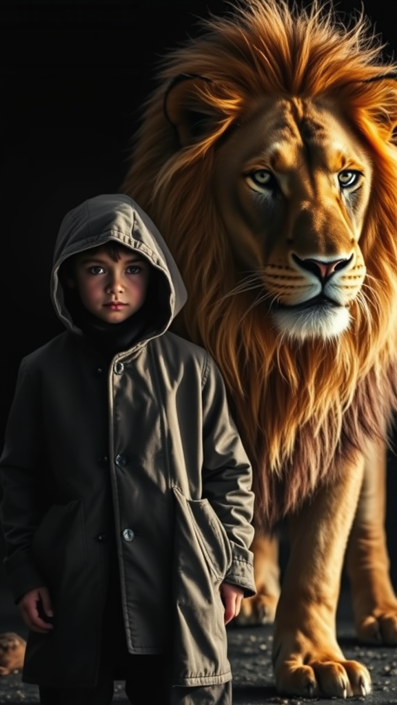 A young boy clad in a heavy coat with a hood stands confidently beside a majestic lion whose mane flows like a river of gold, set against a shadowy backdrop punctuated by dramatic, cinematic lighting; the scene is captured with exceptional detail and depth of field that highlights the textures of their fur and fabric, creating a sense of unity and silent strength between the boy and the regal beast.