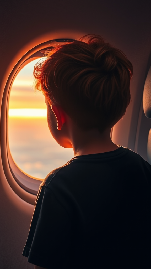 A young boy gazes out the airplane window, mesmerized by the view. Seen from behind, his short, curly hair, a vibrant shade of red, catches the golden hue of the setting sun. The sky outside glows with shades of amber, enhancing the fiery tones of his hair, creating a warm and captivating scene.