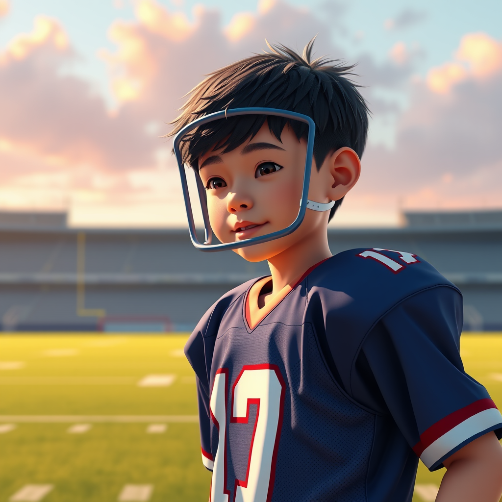 A young boy in a classic American football uniform stands on an expansive field, capturing the charm of a Yanjun Cheng style digital artwork. The scene combines the nostalgic vibe of a lofi girl internet meme, trending on Dezeen, with the clarity of a catalog photo. A 3D render echoes the creativity of Beeple, while drawing inspiration from Rhads and Lois van Baarle. The illustration embodies a cartoon style with bright pastel colors, blending the essence of a retro anime girl into its composition, crafting a captivating and beautiful artwork illustration.