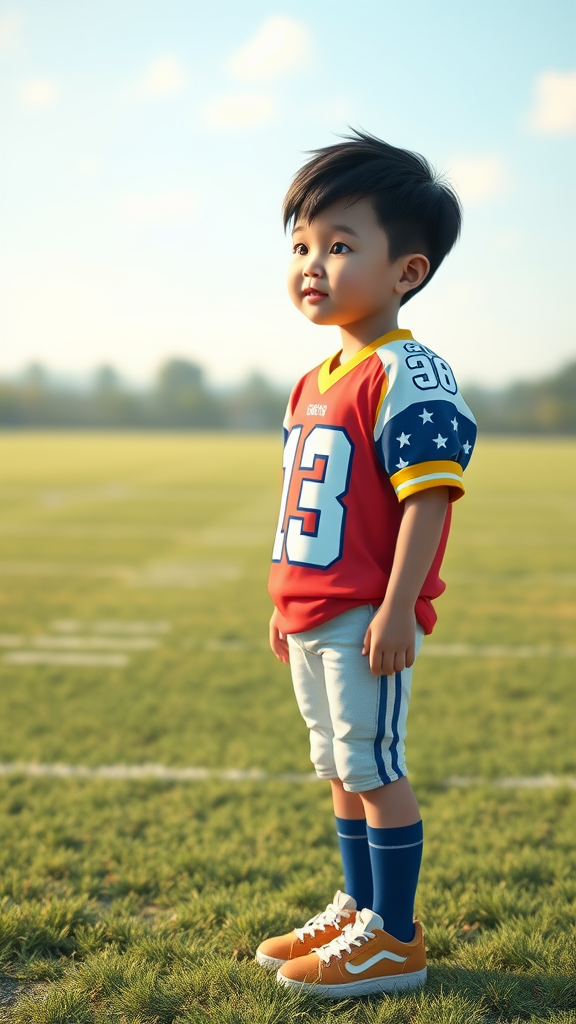 A young boy in a colorful American football uniform stands on a vast field, embodying the charming essence of Yanjun Cheng's artistic style. The digital art echoes the nostalgic vibes of the lofi girl internet meme, as if trending on Dezeen. It resembles a catalog photo with a 3D render quality reminiscent of Beeple, infused with the vibrant cartoon style of Rhads and Lois van Baarle. The scene is bathed in bright pastel tones, creating a captivating illustration that blends retro anime flair with the whimsical innocence of childhood.