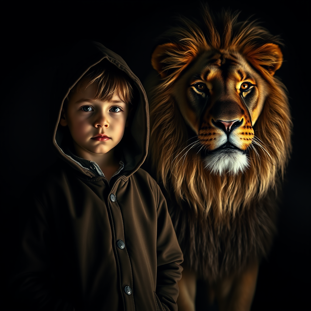 A young boy in a hooded coat stands side by side with a majestic lion, their figures illuminated against a shadowy backdrop, cinematic lighting emphasizes their features, captured with a dramatic depth of field, intricate details highlight the contrasting textures of the boy's clothing and the lion's mane, evoking a sense of wonder and companionship in this evocative scene.