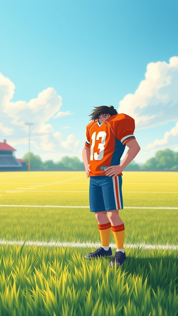 A young boy in a vibrant American football outfit stands confidently on an expansive green field, reminiscent of a dreamy lofi aesthetic. The digital artwork draws inspiration from Yanjun Cheng's style, blending cartoon-like charm with bright pastel colors. Reminiscent of a nostalgic anime, the scene captures a delightful retro vibe. As if trending on Dezeen, the illustration exhibits a contemporary flair, mingling 3D render techniques akin to Beeple with the expressive touches of rhads and Lois van Baarle. The setting evokes a sense of wonder and playfulness, like a catalog photo brought to life, where the lively colors and gentle lines create a harmonious balance of youthful energy and artistic elegance.