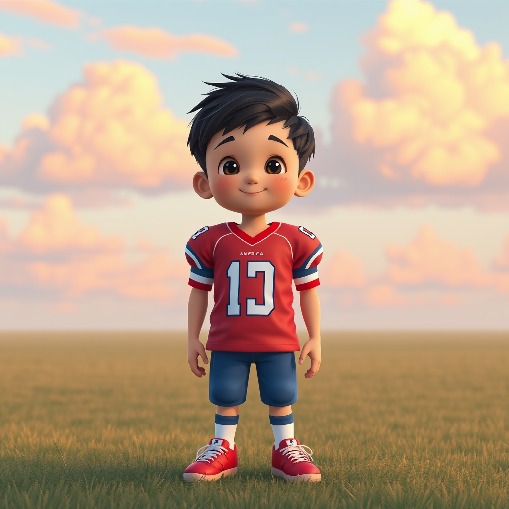 A young boy in a vibrant American football uniform stands confidently on an expansive field under a vast sky, rendered in a digital art style reminiscent of Yanjun Cheng. The scene blends the calming aesthetics of a lofi girl internet meme with the distinctively trending visuals of a Dezeen catalog photo. A 3D render style pays homage to Beeple, while the cartoonish charm is inspired by Rhads and Lois van Baarle. The illustration features bright pastel colors and evokes the nostalgia of retro anime, capturing a sense of adventure and innocence in a visually striking artwork.