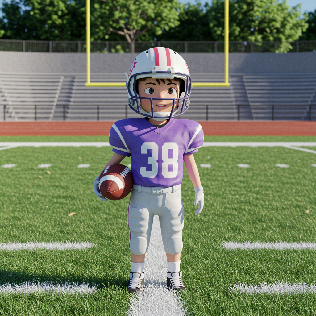 A young boy in a vivid American football uniform stands on an expansive field, capturing a whimsical Tumblr aesthetic. This digital art piece, inspired by Yanjun Cheng's style, blends elements of the lofi girl internet meme, evoking a cozy yet vibrant atmosphere. The imagery draws from trending design concepts seen on Dezeen and emulates the meticulously crafted catalog photos of 3D render artist Beeple. Influences from artists like Rhads and Lois van Baarle infuse the scene with dynamic cartoon elements and bright pastel colors. The boy's expression exudes youthful determination, surrounded by a colorful retro anime aura, highlighting a beautiful blend of nostalgia and innovation.