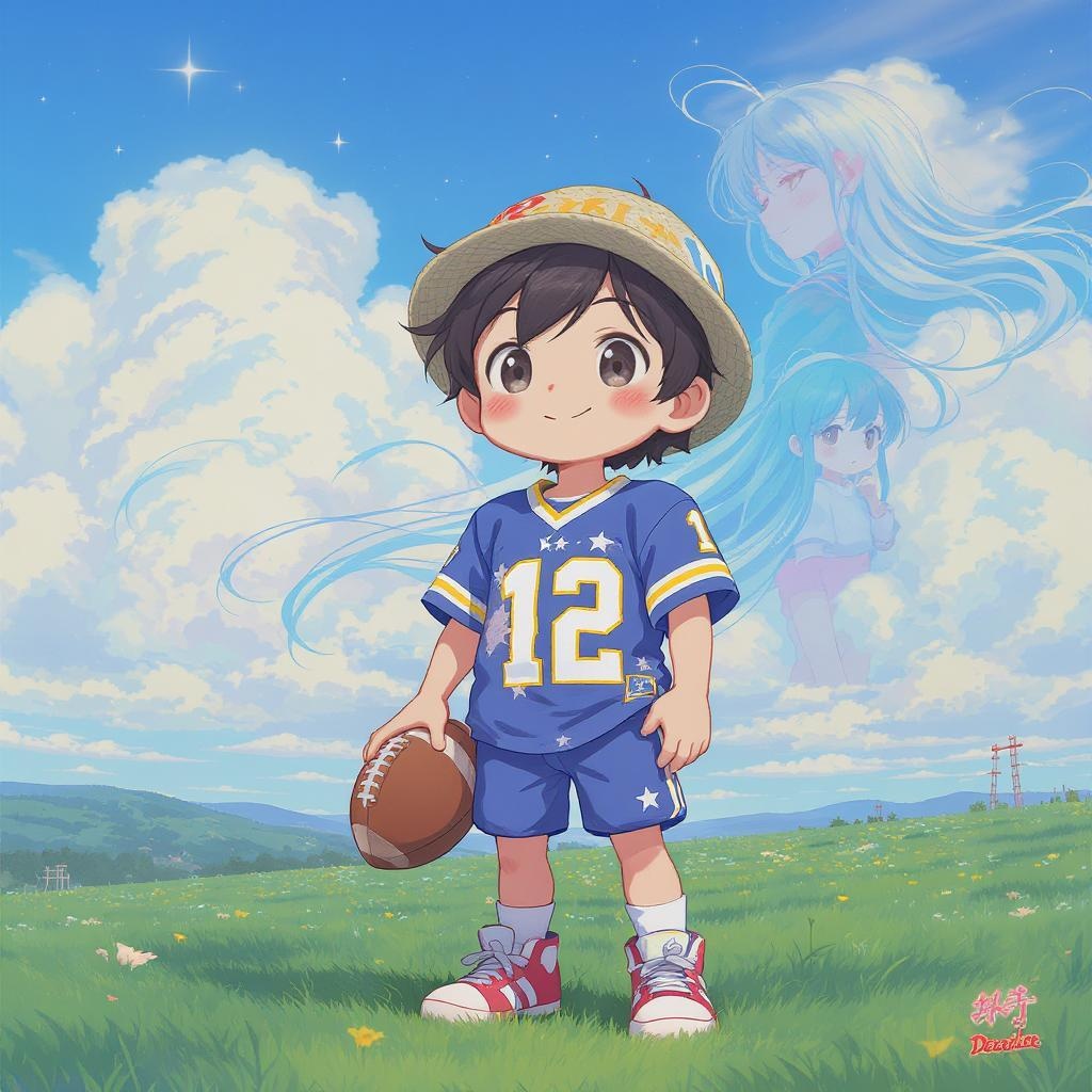 A young boy in an American football outfit stands on a vast field, capturing the playful essence of nostalgia. The scene evokes the digital art style reminiscent of Yanjun Cheng, blending with the lofi internet meme aesthetic, akin to the comforting familiarity of a lofi girl. The artwork trends with the sophisticated design touch seen on Dezeen and resembles a polished catalog photo. With influences from 3D render geniuses like Beeple and illustrators Rhads and Lois van Baarle, this cartoon-style illustration pops with bright pastel colors. It features a retro anime-inspired girl subtly woven into the background, resulting in a stunningly beautiful artwork that plays with both contemporary and vintage influences.