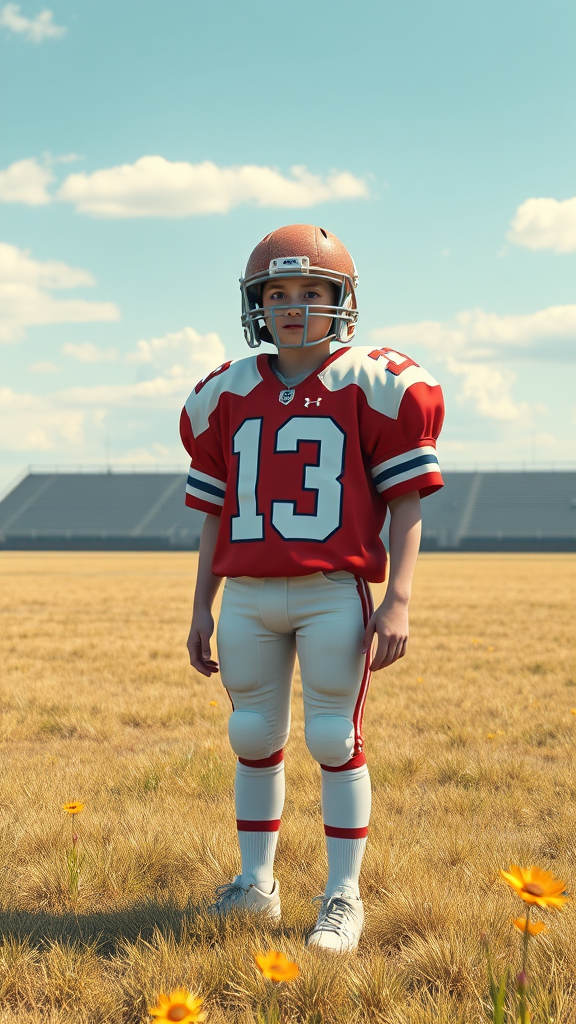 A young boy in an oversized American football outfit standing on an expansive field, digital art inspired by Yanjun Cheng, featuring elements from the lofi girl internet meme. The piece is reminiscent of trending designs on Dezeen, resembling a catalog photo with 3D render qualities akin to Beeple. Influences of Rhads and Lois van Baarle shine through in a cartoon-style illustration, using bright pastel colors. A fusion of retro anime aesthetics with a playful twist, this artwork captures a vibrant and nostalgic atmosphere.