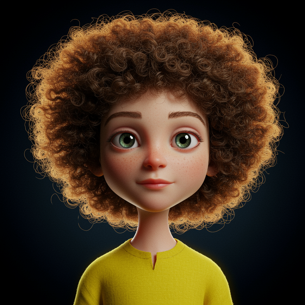 A young boy with a head of curly hair, dressed in a bright yellow shirt, captured in the style of cinema4d-rendered, enchanting characters. His features are stunningly beautiful with a hint of nostalgia reminiscent of Rudolph Belarski's work. The image is packed with blink-and-you-miss-it details and dramatic shading that accentuate his cartoonish, caricature-like charm. The vibrant colors and intricate textures bring the scene to life, giving it a surreal and captivating allure.